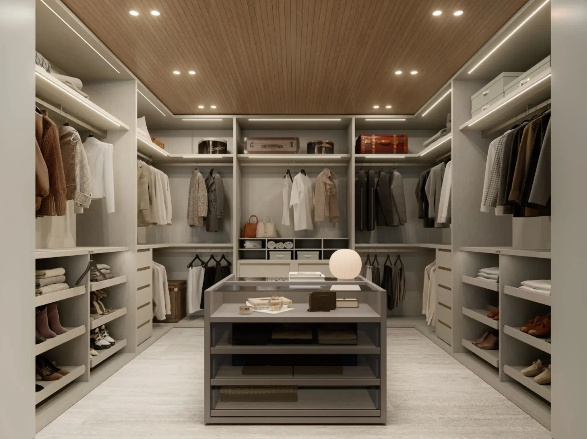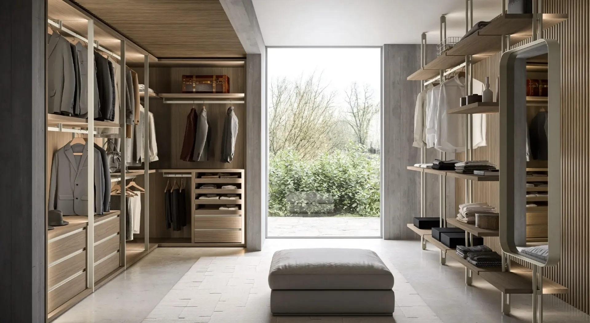 La cabina armadio Bellavista offre ampia personalizzazione interna con ripiani, cassetti, tubi appendiabiti e accessori. È possibile definire la divisione interna per ottimizzare ogni vano.
