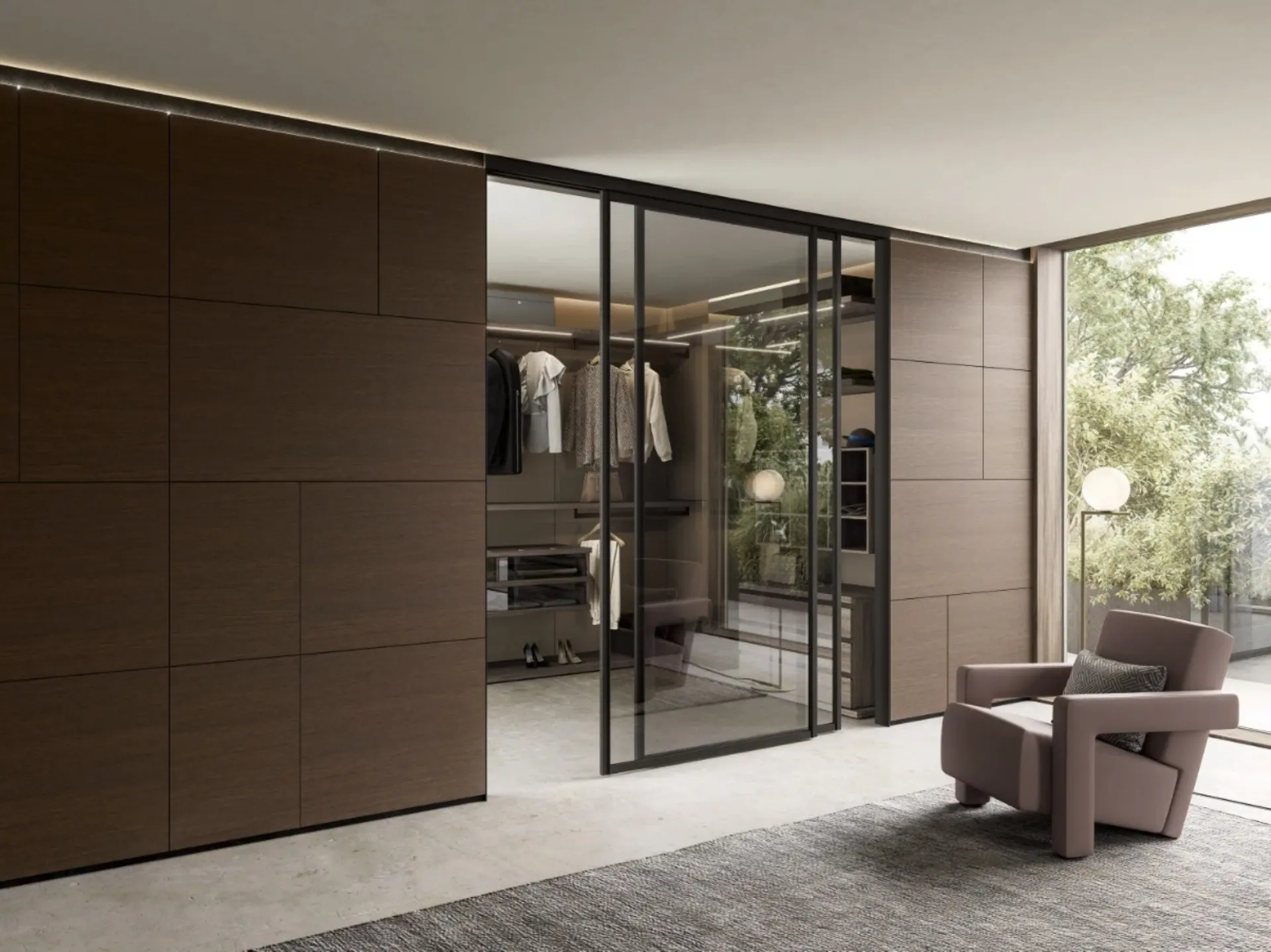 La Cabina Armadio Panorama può essere configurata con diverse soluzioni interne, come ripiani, cassetti e tubi appendiabiti. È possibile personalizzare le dimensioni standard e visionare i campioni di materiali presso la nostra materioteca.