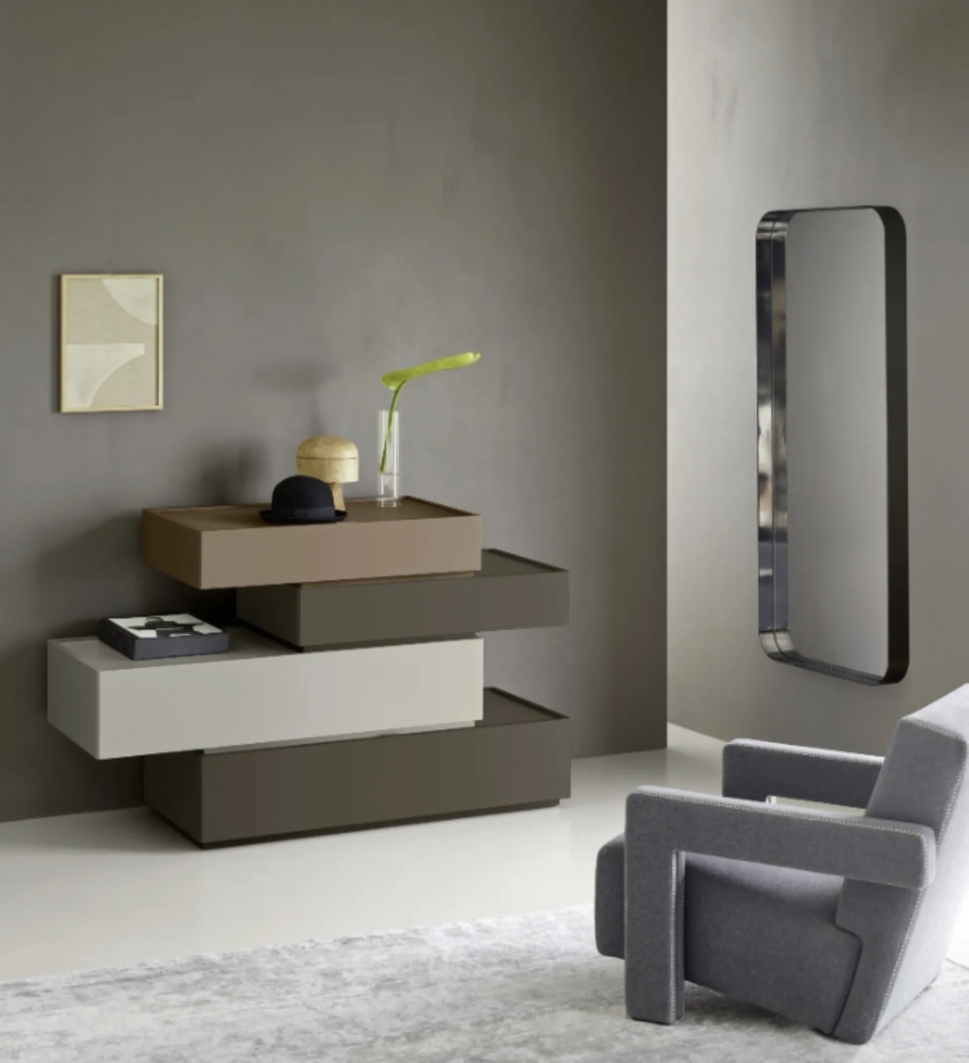 Il comò Cidori di Sangiacomo si inserisce in una raffinata serie di mobili contenitori per la zona notte. La sua peculiarità risiede nei frontali e schienali con un design rialzato che genera un distintivo effetto a vassoio, offrendo un alto grado di personalizzazione. La struttura è caratterizzata da eleganti giunzioni a 45° tra i frontali e i fianchi, con bordi finemente arrotondati che ne esaltano la cura costruttiva. Le soluzioni di apertura sono molteplici, da una maniglia integrata e discreta alla possibilità di utilizzare il bordo sporgente del cassetto per una presa ergonomica. È disponibile in una vasta gamma di finiture laccate, sia nella versione opaca che lucida, garantendo un'integrazione perfetta in ambienti moderni e di classe. Scopri l'eccellenza dei materiali e le finiture disponibili per personalizzare il tuo spazio.