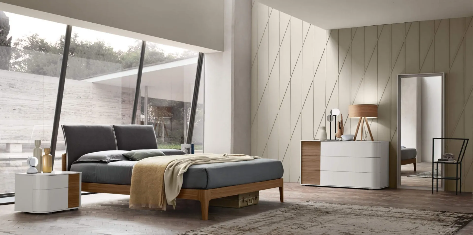 | Materiale: | Struttura in melaminico (effetto legno, laccato, cemento) o laccato (opaco, poro aperto). Testiera rivestita in tessuto, ecopelle o lino. |