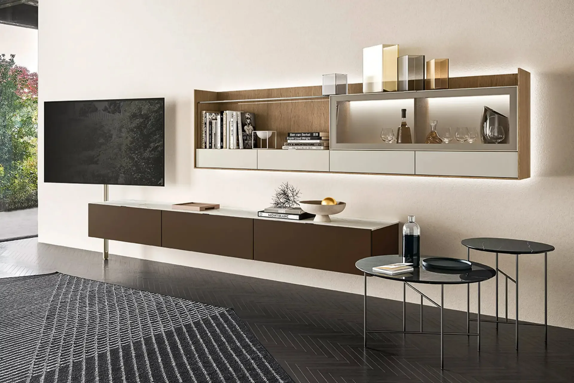 I mobili porta TV moderni, come il Tv Video Laccato, sono generalmente progettati con vani o passacavi integrati. Questo permette di organizzare decoder, console e soundbar in modo ordinato e discreto.