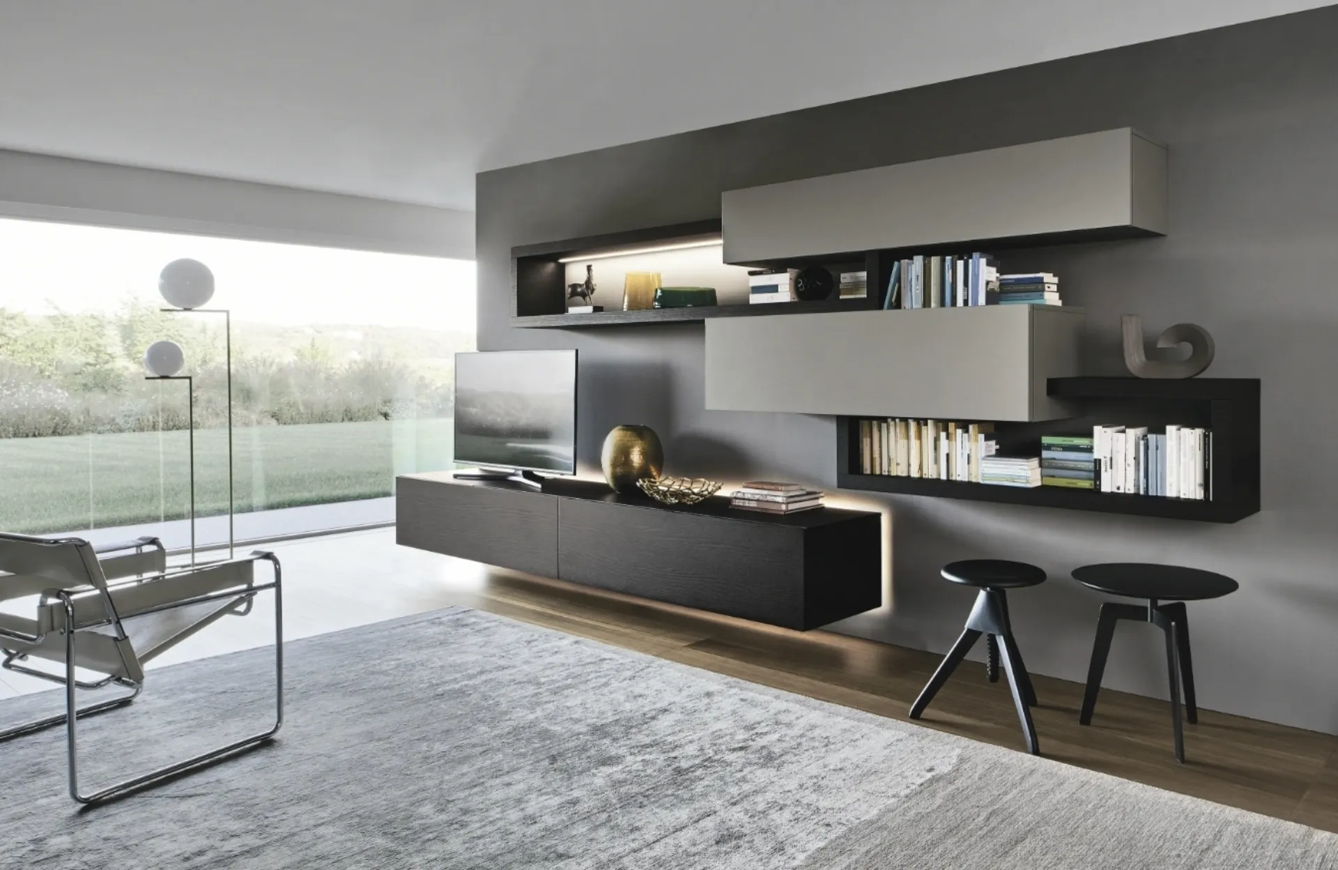 Il Sistema Giorno Lampo di Sangiacomo eccelle come soluzione d'arredo intrinsecamente modulare e configurabile, concepita per elevare l'estetica e la funzionalità degli spazi living contemporanei. La sua architettura offre una flessibilità progettuale senza precedenti, consentendo la fusione armonica di elementi distinti, geometrie variegate, palette cromatiche e texture per definire ambienti di rara unicità e pragmatismo. Le configurazioni integrate spaziano da mensole a contenitori a giorno, fino a pensili tecnologicamente avanzati, spesso equipaggiati con meccanismi di apertura vasistas o battenti ammortizzati e cassetti con estrazione totale, assicurando un'interazione fluida e una durabilità superiore. La gamma di finiture disponibili è ampia e sofisticata, includendo laccati opachi, impiallacciature in rovere di diverse tonalità (quali Cenere, Argilla, Carbone, Nodato Naturale, Nodato Caramello, Termotrattato) e Noce Canaletto, oltre a superfici materiche e dettagli metallici. La poliedricità del sistema si estende all'integrazione di sistemi multimediali, come supporti porta TV anche girevoli, e soluzioni di illuminazione a LED, ottimizzando l'esperienza d'uso. Approfondimenti sulle specifiche tecniche dei materiali e le opzioni di finitura sono disponibili per una completa comprensione del prodotto.