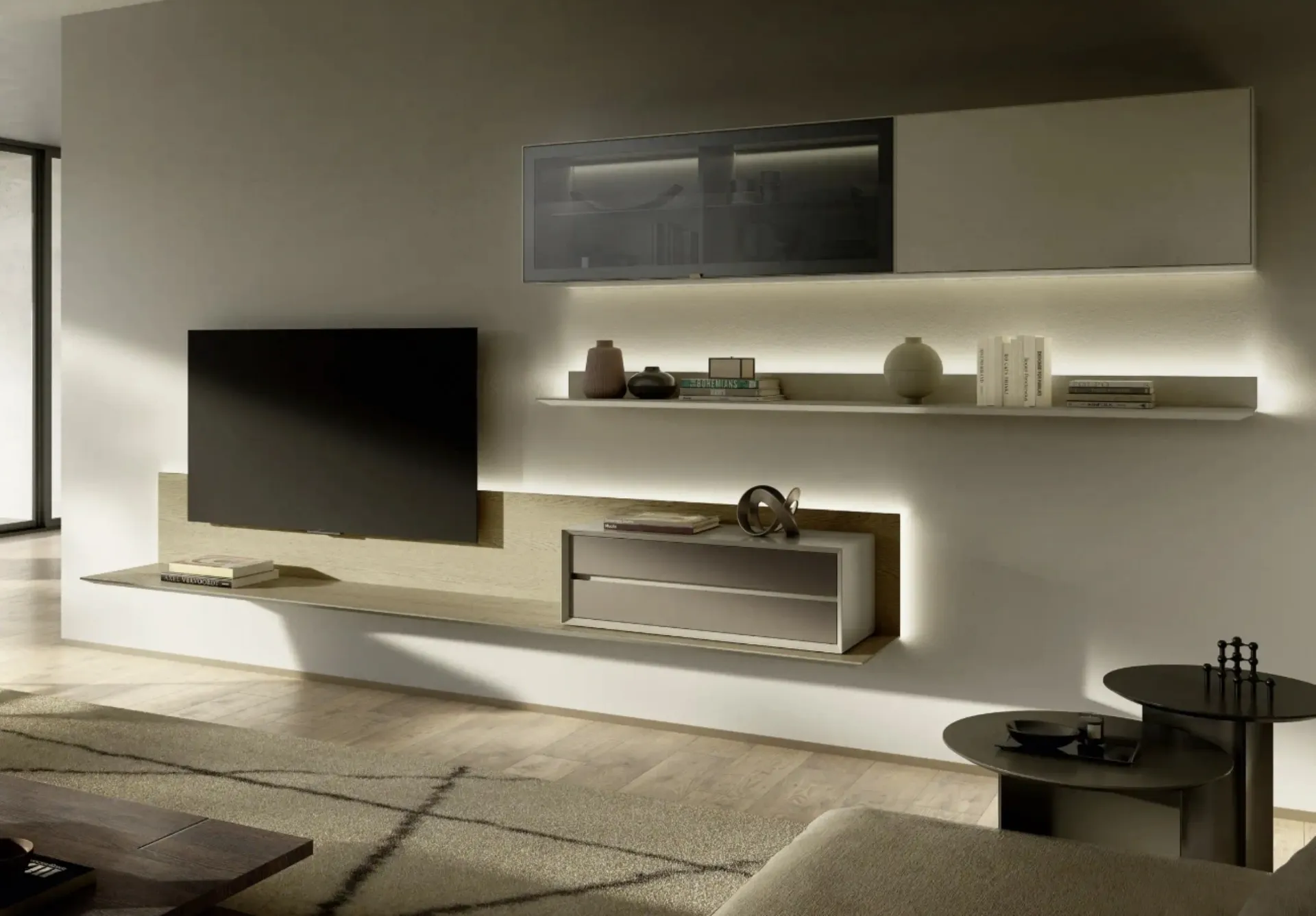 La parete attrezzata Domino 02 si compone di basi, pensili, colonne e moduli TV. Include anche mensole, ripiani a giorno e diverse tipologie di ante come battenti, a ribalta o push-pull, con possibilità di illuminazione LED integrata.
