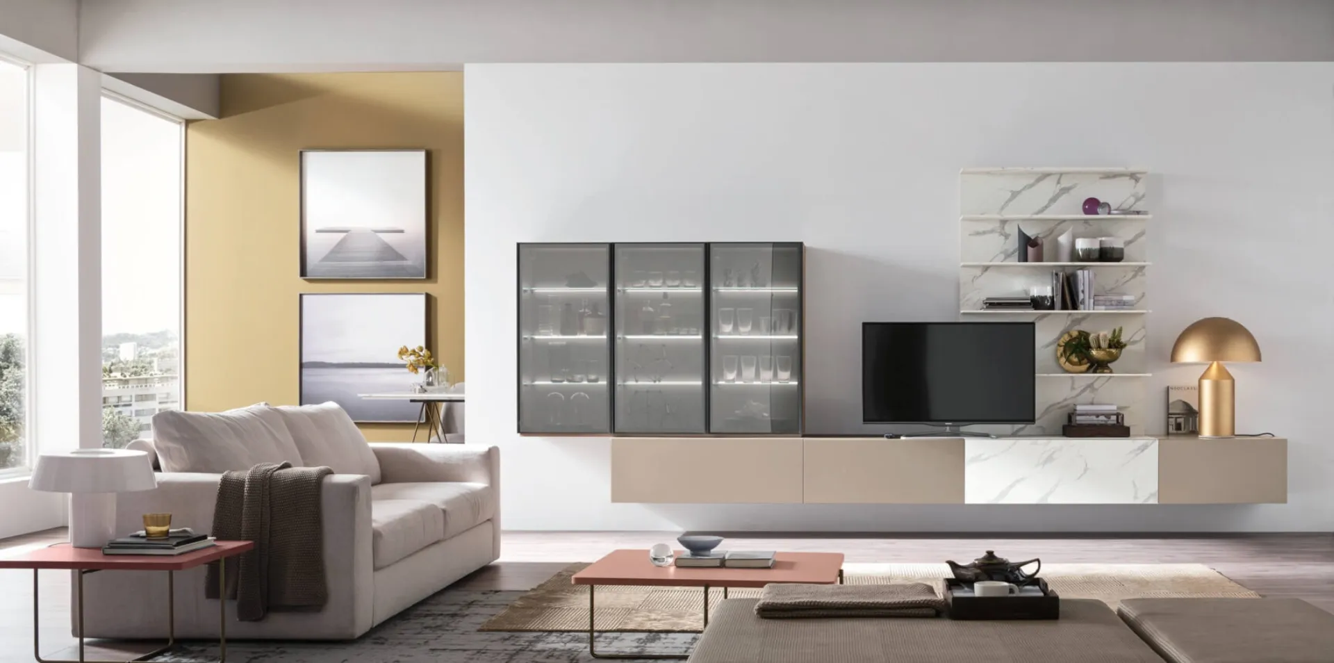 | Materiale: | Melaminico Rovere Avena, Marmo Calacatta, Laccato opaco Canapa, Vetro Stop Sol Bronzo |