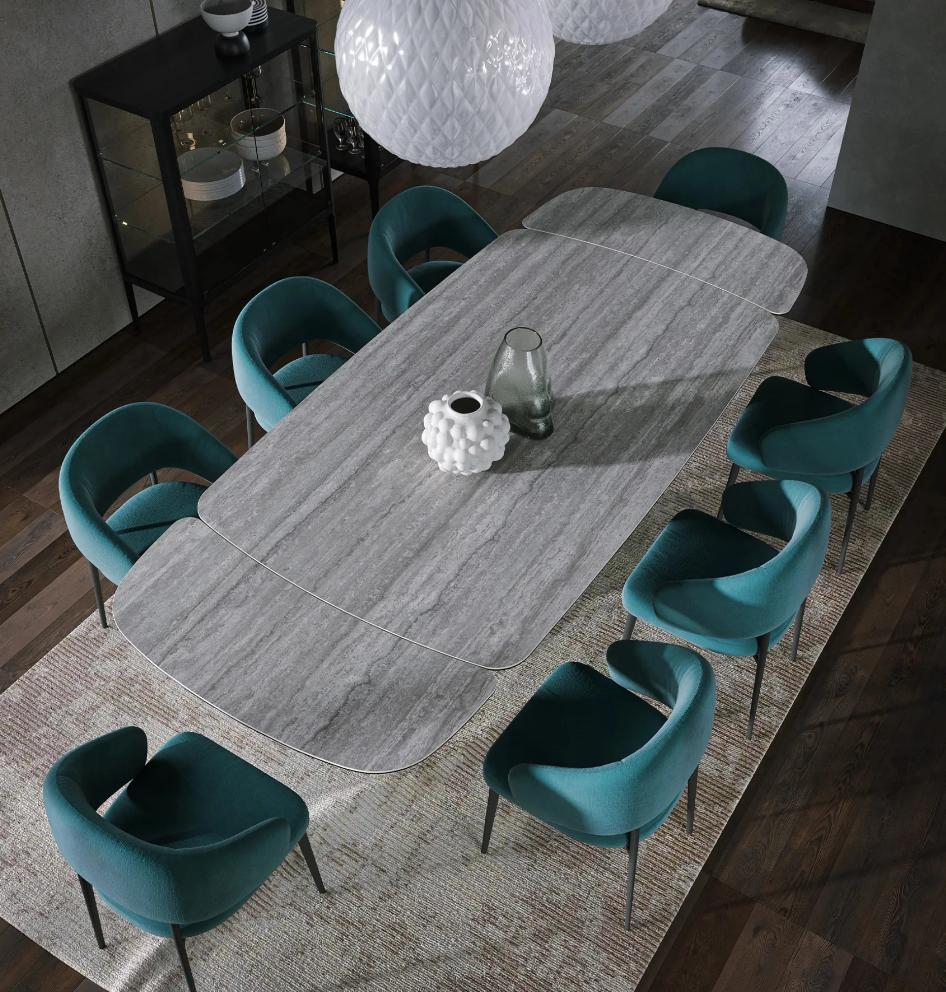 Se sei alla ricerca di un tavolo da pranzo di alto contenuto estetico, contattaci e ricevi informazioni e preventivi sul modello presente in foto. Ideali per dare vita a degli accostamenti unici con sedute e complementi design, i Tavoli allungabili dell'azienda sono soluzioni tra le più originali in commercio, ideali per il soggiorno e la cucina. Un modello come quello nella fotografia, in abbinamento alle giuste sedute, saprà arricchire l'atmosfera delle stanze domestiche dedicate in assoluto all'ospitalità. Tavolo Sipario Ext in gres travertino di Tonin Casa: realizzato in materiali durevoli è connotato dalle forme decise del top e da un basamento ricercato ed elegante.