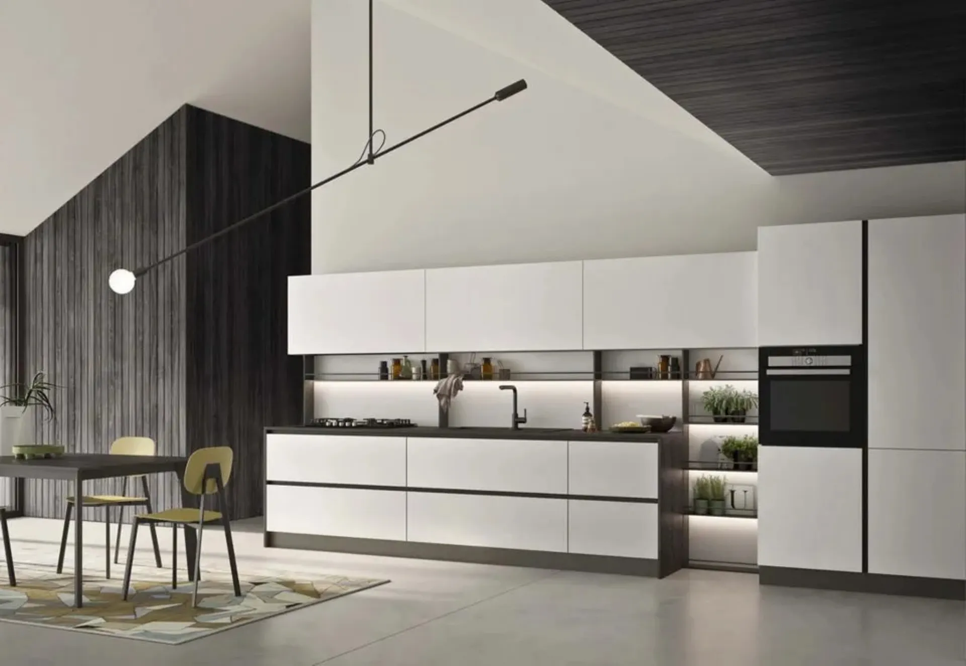 Questo sistema d'arredo cucina si distingue per la sua modernità e versatilità, offrendo infinite possibilità di personalizzazione. I moduli, con ante da 22mm, sono realizzati in robusto melaminico bifacciale e rifiniti con bordature in ABS, garantendo durabilità e resistenza all'usura. L'innovativo design e la cura nella scelta dei materiali assicurano una soluzione d'arredo durevole e adattabile a diverse esigenze stilistiche. La robustezza costruttiva è supportata da una garanzia estesa sui componenti, a testimonianza della qualità intrinseca del prodotto.